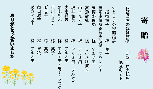 令和2年度は、かつて経験したことのないコロナウィルスという感染症で大変な一年を過ごしました。保護者の皆様方をはじめ地域の皆様また、行政・医療・福祉関係者の方々には、施設感染予防対策にご理解、ご支援を賜り誠にありがとうございました。