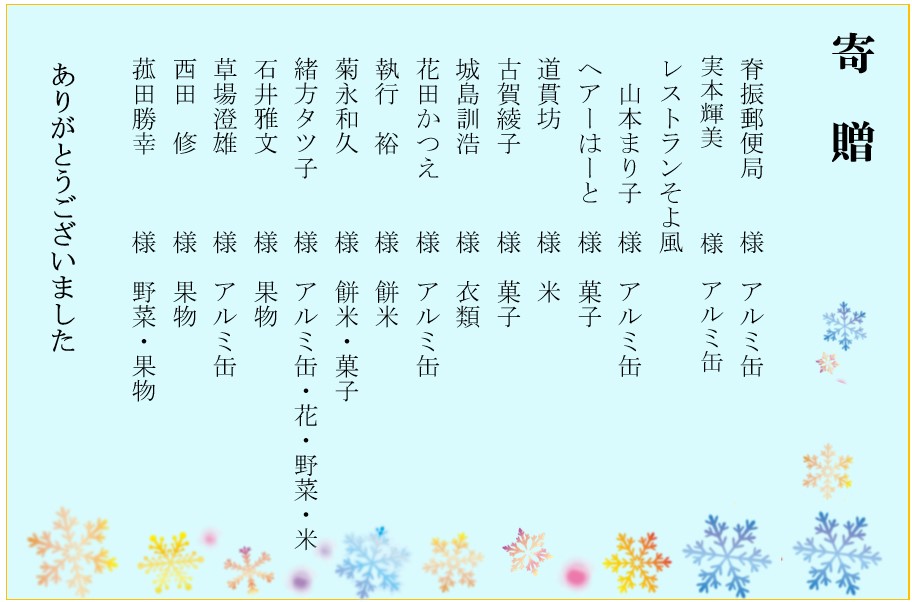 「NHK歳末助け合い募金」より義援金を頂き行事の際の飲み物、ターゲットプレイシートやカラオケチップ、理髪セットを購入しました。